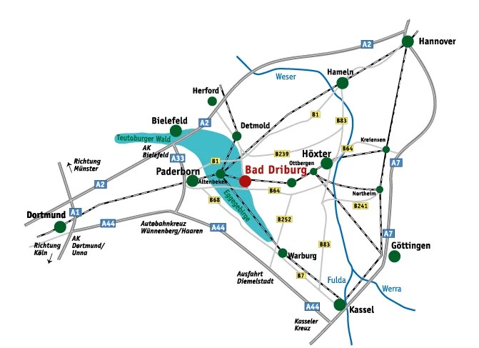 aus Süden/Osten kommend: Autobahn A5 bzw. A7 Richtung Kassel bis Autobahnkreuz Kassel, dort auf die Autobahn A44 Richtung Dortmund/Paderborn bis Ausfahrt Diemelstadt/BadDriburg. Von dort der Beschilderung nach Bad Driburg folgen.